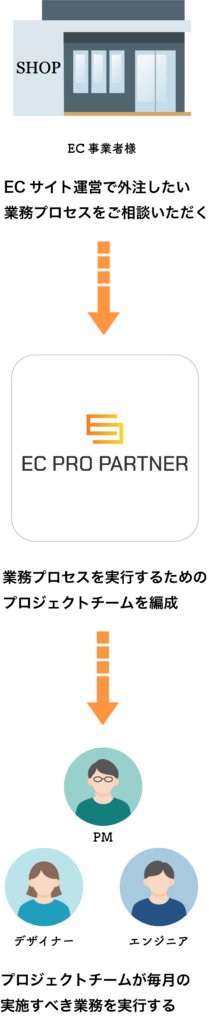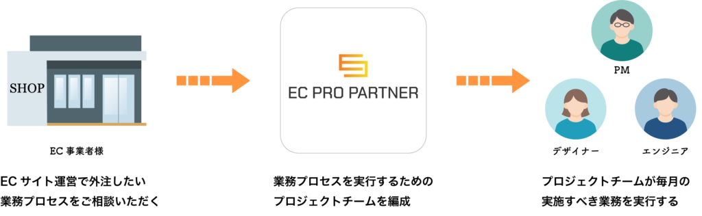 EC事業者様ごとに最適なメンバーで構成されるプロジェクトチームを編成して、事前に取り決めた業務を毎月実行して、事業成長に貢献します。